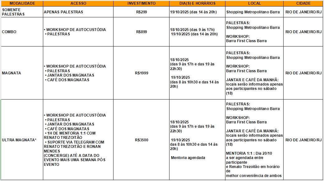DIA 18/10/2025 - Workshop de autocustódia - com Renato Trezoitão e outros monitores convidados. Local: Barra First Class. Endereço: Av. das Américas, 7897 - Barra da Tijuca, Rio de Janeiro - RJ, 22793-081, Brasil. Não esquecer de levar um laptop.